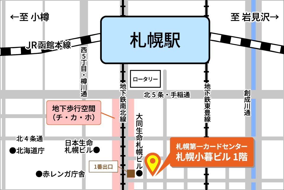 - ビルの1階に「札幌市マイナンバーカードセンター」の入口があります。JR札幌駅からは全行程で徒歩約7分ほどです。
